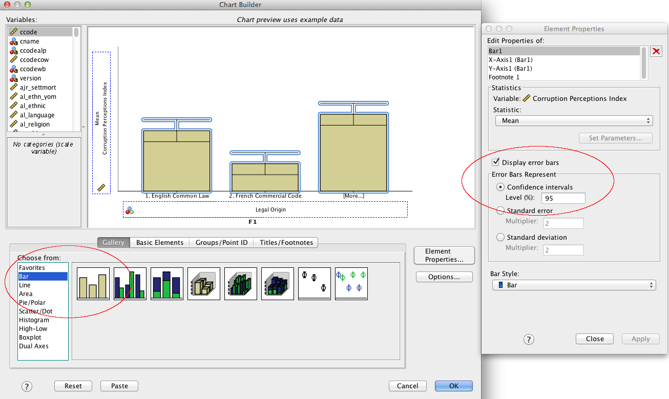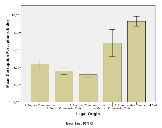 Man ser snabbt att genomsnittet är högst (minst förekomst av korruption) i länder med ”Scandinavian commercial code” och lägst i länder med ”Socialist/Communist Laws”. Det här är stapeldiagrammets styrka – det är enklare att se medelvärdesskillnader än i en tabell. Felstaplarna varierar i omfång. För länder med ”German commercial code” är felstapeln mycket större, vilket beror på att det är ganska få länder med stor spridning som har det här systemet. Konfidensintervallet blir då större än om det varit fler länder.