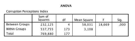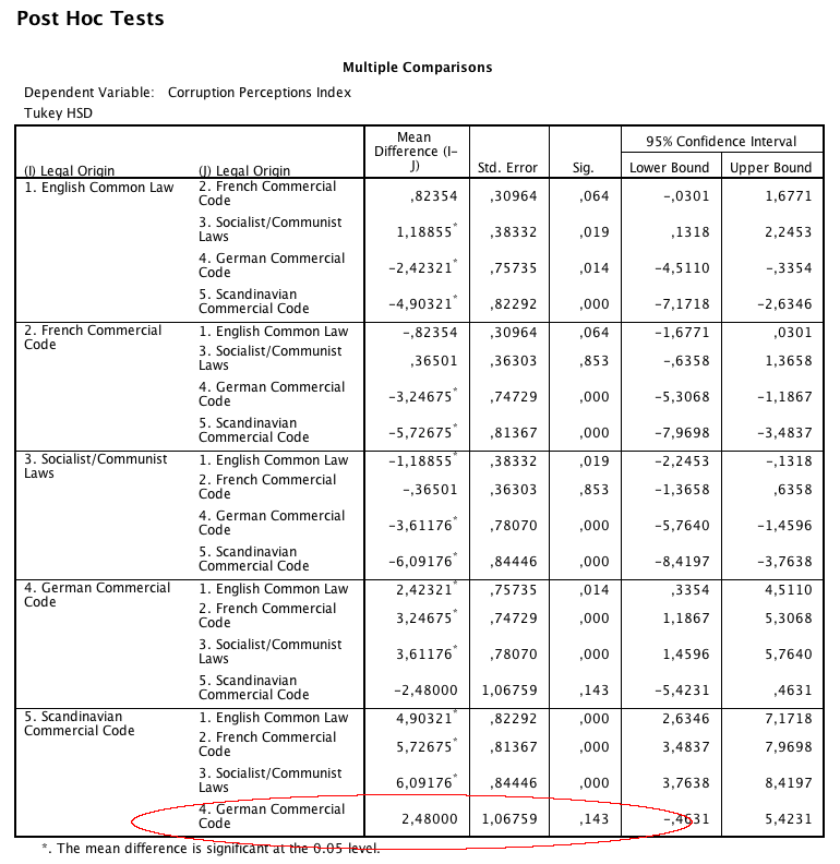 En variansanalys visar om det är troligt att alla medelvärden är samma i den stora populationen, eller om minst två medelvärden kan förväntas skilja sig åt (signifikanstester är som sagt utvecklade för jämförelser i urval – här handlar det ju inte om ett urval av länder, vilket gör att signifikanstester egentligen inte är tillämpbara. Likväl används de ofta på den här typen av data ändå). Signifikansvärdet är ,000 vilket innebär att det är osannolikt att alla medelvärden är desamma – inte så konstigt med tanke på vilka stora skillnader man kunde se mellan länder med ”Scandinavian commercial code” och resten.
